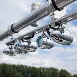 Système d’éclairage pour tour de wake ou ski nautique comprenant 5 lampes chromés. Deux des lampes sont orientés dans une direction et les trois autres lampes dans la direction inverse.